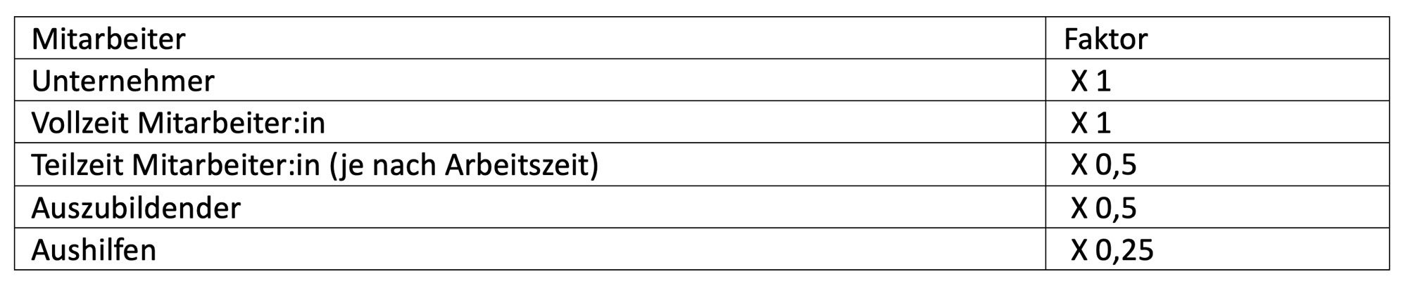 Um die Produktivität zu berechnen, müssen Sie alle Mitarbeiter (einschließlich des Betriebsinhabers und mithelfender Familienangehöriger) auf Vollzeitstellen umrechnen. Nutzen Sie hierfür folgende Faktoren:
