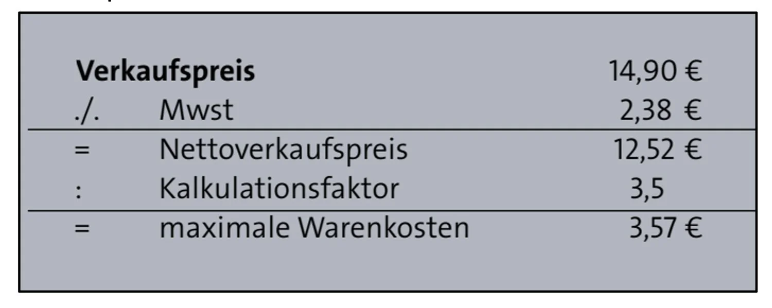 Kalkulationsfaktor = geplanter Betriebsumsatz netto / geplante Warenkosten