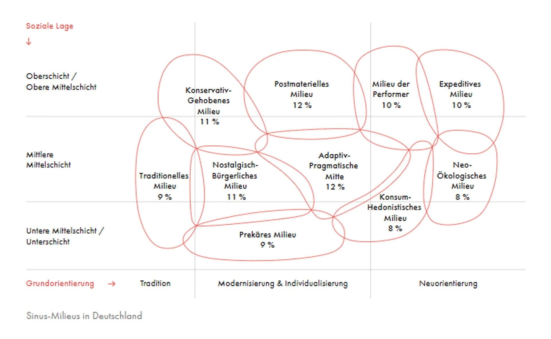 Alter und Einkommen allein sagen heute wenig über das Konsumverhalten aus. Ein 30-jährige Software-Entwickler kann dieselben Werte teilen wie eine 60-jährige Lehrerin. Die Sinus-Milieus helfen uns, Menschen nach ihrer Grundhaltung und ihrem Lebensstil zu gruppieren.